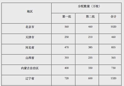 分配数量也已经公布。其中,北京第一批数量为560万枚。