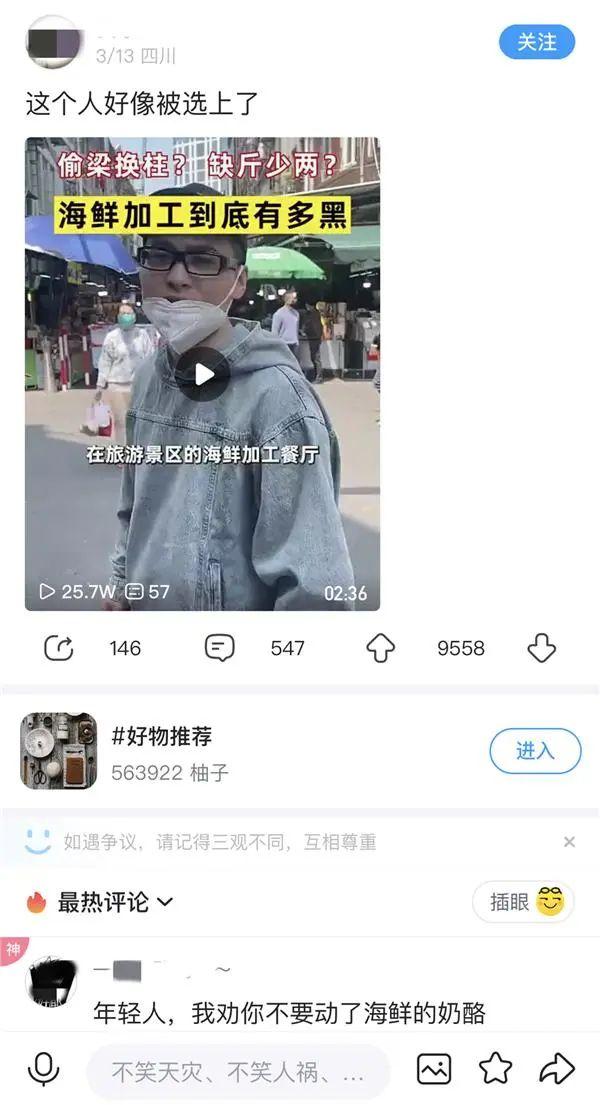 3月15日,博主@superB太 发文称,在连续发布视频曝光厦门某景区海鲜市场偷梁换柱、缺斤少两后遭遇网络“悬赏”。