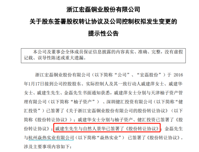 当年1月20日,公司公告称,戚建生与自然人景华已签署了《股份转让协议》,拟向景华转让股份共计1118.4万股,占公司总股本的5.09%。