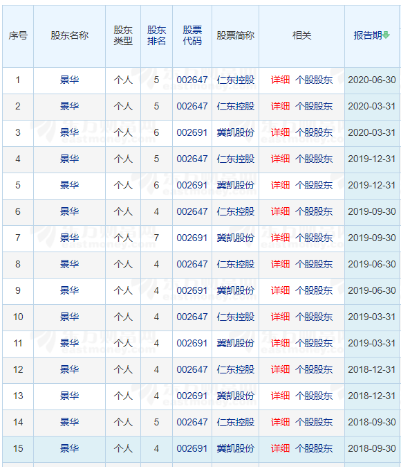 据东方财富数据显示,景华除了持有过仁东控股外,其还曾持有过冀凯股份、东方银星、学大教育、皇台酒业等,并成为上述公司的前十大股东。