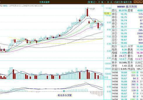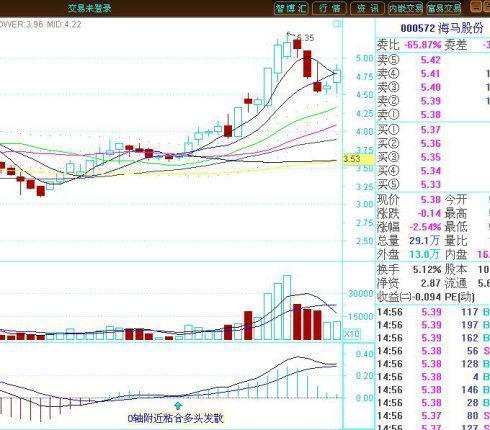 3、股价在10小时线上方不远处向下靠近10小时线,此时不管是平台整理,还是单边下跌,只要MACD没有出现背离,就要在10小时线上档价位,用前期 离场资金积极参与。最后的升势会在出现急速放量(主力对敲吸引跟风盘)的上标志性K线,或长上影线,或长阴线,股价上涨而MACD的峰位比前峰低(背离) 时结束,EXPMA指标出现死叉,从而完成5浪。此时此刻,如果K线组合出现第二根K线的最高价,低于前一根K线的最高价,MACD的红柱第一次缩短,立 刻在第一时间内向买三或更低价派单,清仓离场。