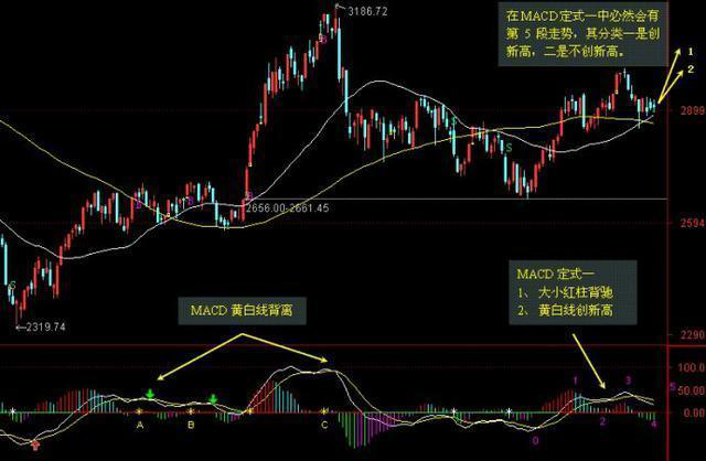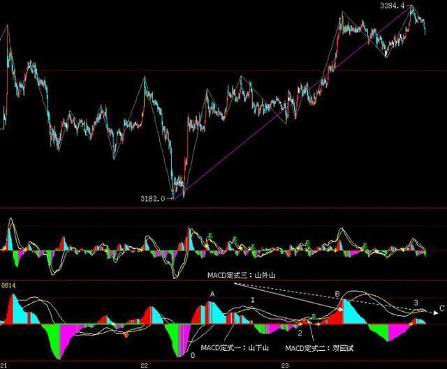 MACD定式一“山下山”形态与MACD黄白线背离形态最大的区别就在于黄白线是否仍在继续爬高,股价创出新高而黄白线不再爬高属背离形态应果断空仓。