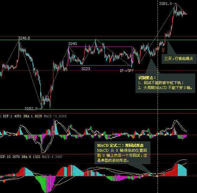 2) DIFF和DEA在0轴附近粘合多头发散:此形态通常是股价从底部经过一段上涨进行强势横盘之后开始向上突破或者是从阶段性顶部经过一段下跌回到60天线附近筑底完成之后形成的,是最具操作价值的形态,通常爆发力和持久力都很强;