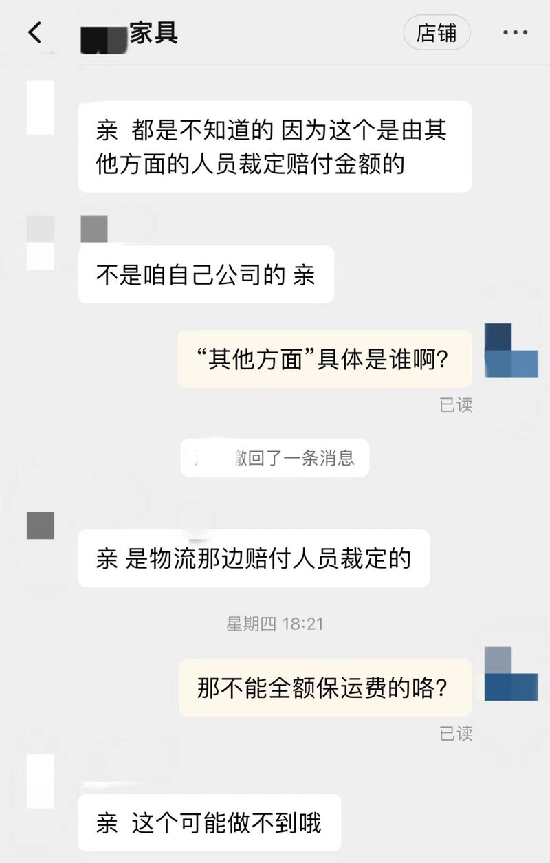 针对家电、建材、家具等大件商品,部分店铺还提供“大件运费险”。但不论是商品页面还是客服介绍,也都无法明确消费者可以获得的赔偿金额或者退费保险计算方式。但有客服明确说,“不太能全额支付快递费”。