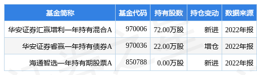 根据2022年报公募基金重仓股数据,重仓该股的公募基金共3家,其中持有数量最多的公募基金为华安证券汇赢增利一年持有混合A。华安证券汇赢增利一年持有混合A目前规模为0.18亿元,最新净值1.1629(4月13日),较上一交易日上涨0.0%,近一年上涨5.95%。该公募基金现任基金经理为汪志健 樊艳 刘杰。汪志健在任的基金产品包括:华安证券聚赢一年持有A,管理时间为2021年4月26日至今,期间收益率为12.26%;华安证券合赢九个月持有,管理时间为2021年7月2日至今,期间收益率为9.67%。樊艳在任的基金产品包括:华安证券聚赢一年持有A,管理时间为2021年4月26日至今,期间收益率为12.26%;华安证券合赢六个月持有债券,管理时间为2021年8月16日至今,期间收益率为6.97%;华安证券合赢三个月持有债券,管理时间为2021年11月3日至今,期间收益率为5.99%。刘杰在任的基金产品包括:华安证券合赢添利债券,管理时间为2021年9月24日至今,期间收益率为5.68%;华安证券合赢三个月持有债券,管理时间为2021年11月3日至今,期间收益率为5.99%;华安证券睿赢一年持有债券A,管理时间为2021年12月3日至今,期间收益率为6.69%;