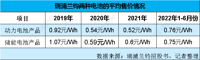 0.75元/Wh,这是瑞浦兰钧披露的2022年1~6月份储能电池产品的平均售价。