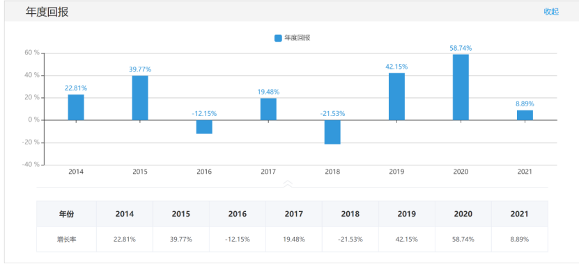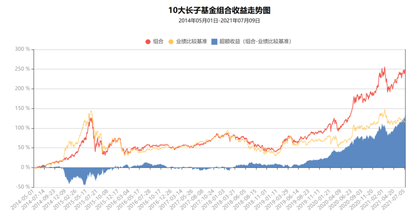 2014年5月1日至2021 年7月9日的年度业绩中,10大长子基金的基金组合仅在2016年和2018年出现了负收益,其他时间均取得了正收益。