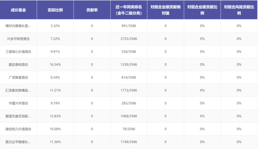 由于组合在系统中创建的时间比较短,部分参数还没有得到计算结果。不过从各只基金在组合中的比例关系变化,也可以看出基金组合创建7年来的各只基金的增长情况。由于2014年5月1日组合创建之初采用了等权的方式创建组合,因此在2021年7月9日,在组合中占比越高的基金说明在统计区间获得的净值增长越高。所以组合中嘉实泰和、富国天盛灵活配置、易方达平稳增长、汇添富优势精选和建信恒久价值五只基金贡献要高于其他五只基金,其中又以嘉实泰和混合贡献最大,该基金在期末占比高达16.34%显著高于其他成分基金。