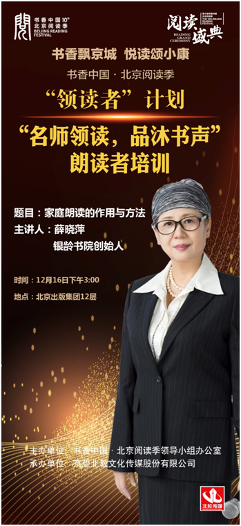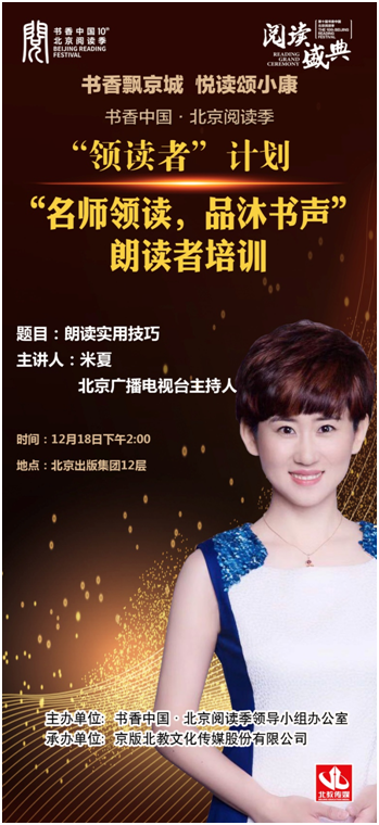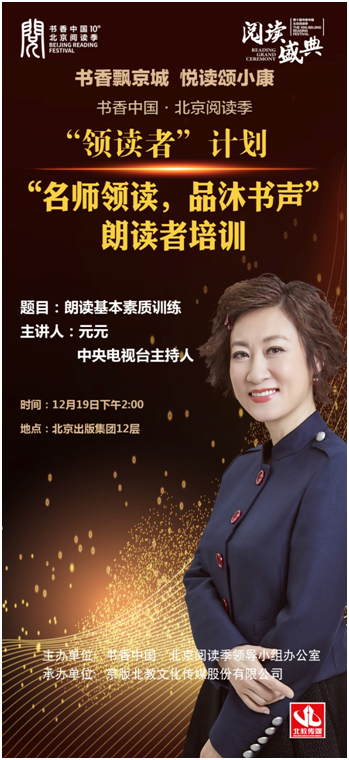 朗读是阅读的起点,为让更多人了解掌握朗读技巧和方法,提升全年龄段群体阅读量与阅读力,助力书香社会建设,北京阅读季阅读盛典期间,“领读者”计划邀请了中央广播电视总台主持人马宗武、中央电视台主持人元元等名家为大众打造了以“名师领读,品沐书声”为主题的朗读专场培训课程。
