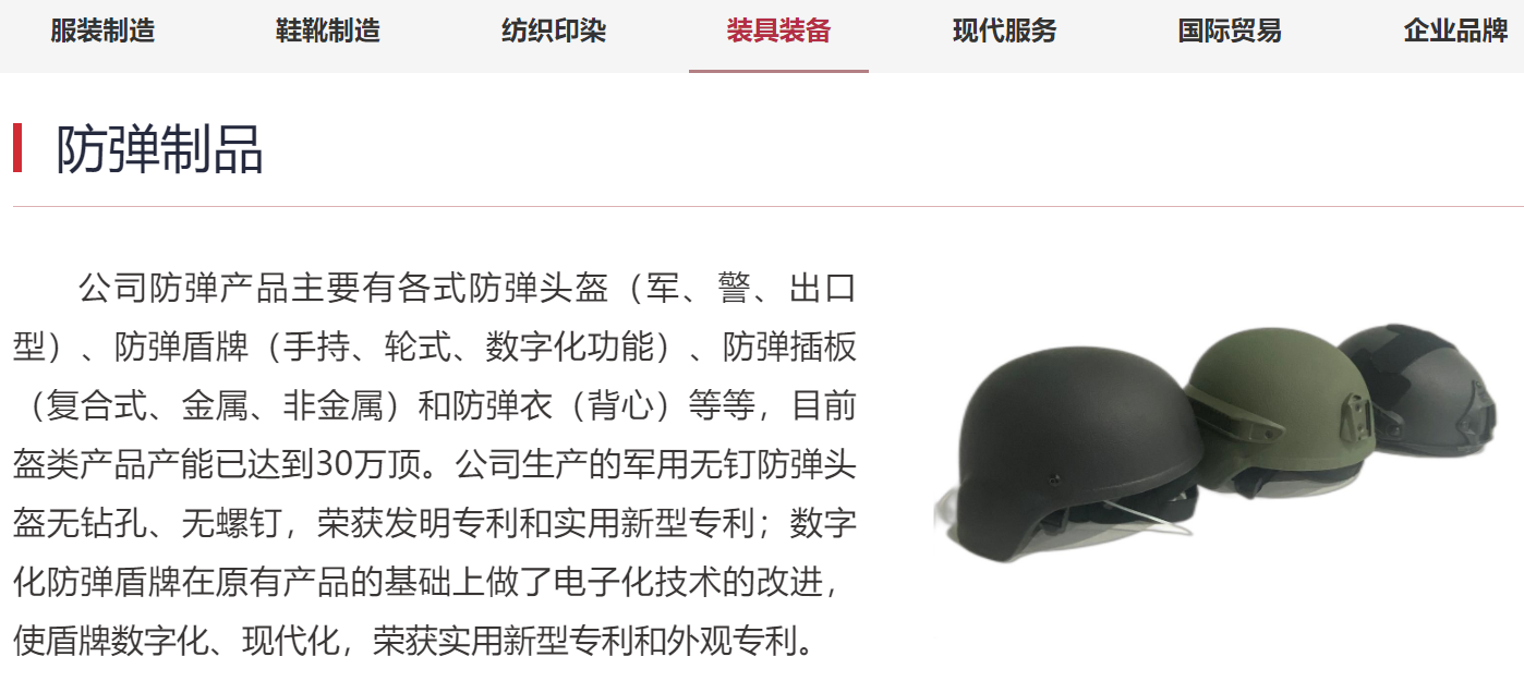 此次被提及的“防弹衣”属“防护装具”板块业务,际华集团对外称,部分子公司从事功能性防护制品及装具、环保滤材等产品的研发、生产和销售,其中防护制品主要产品包括防弹衣、防弹头盔、防弹插板、防弹护具及其他功能器件等。