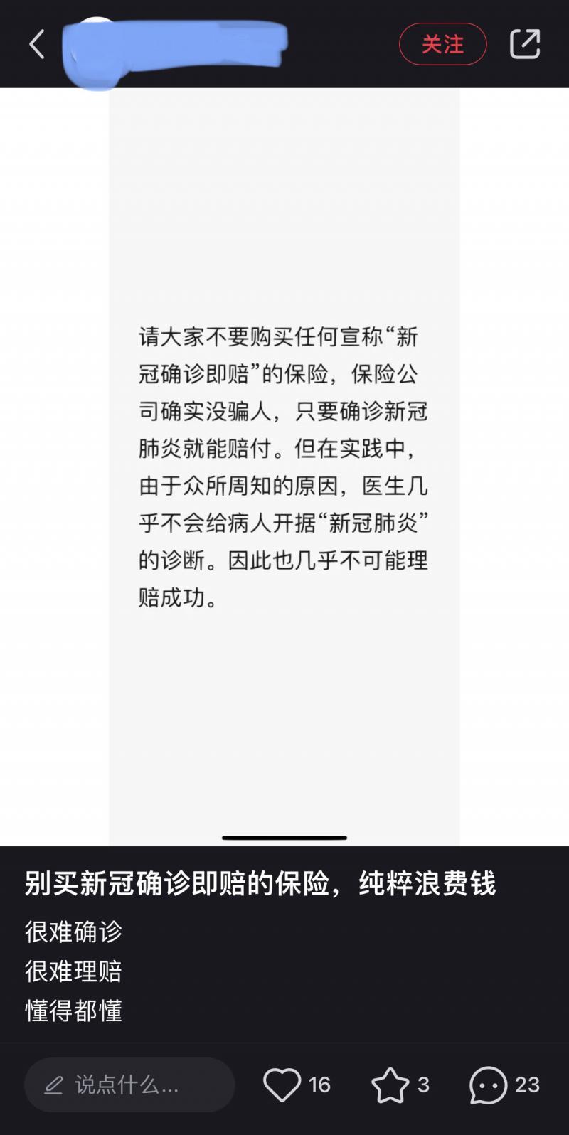 某社交平台上,还有网友吐糟“别买新冠确诊即赔的保险,很难确诊、很难理赔,懂的都懂”。多位网友点赞后也表示,跑了两家医院才知道根本没法开“诊断证明”;还有网友的遭遇与郑先生、李小姐一样,称“听说我要做’胸部CT’,医生惊呆了,过度检查完全没必要,让吃退烧药回家休息。”