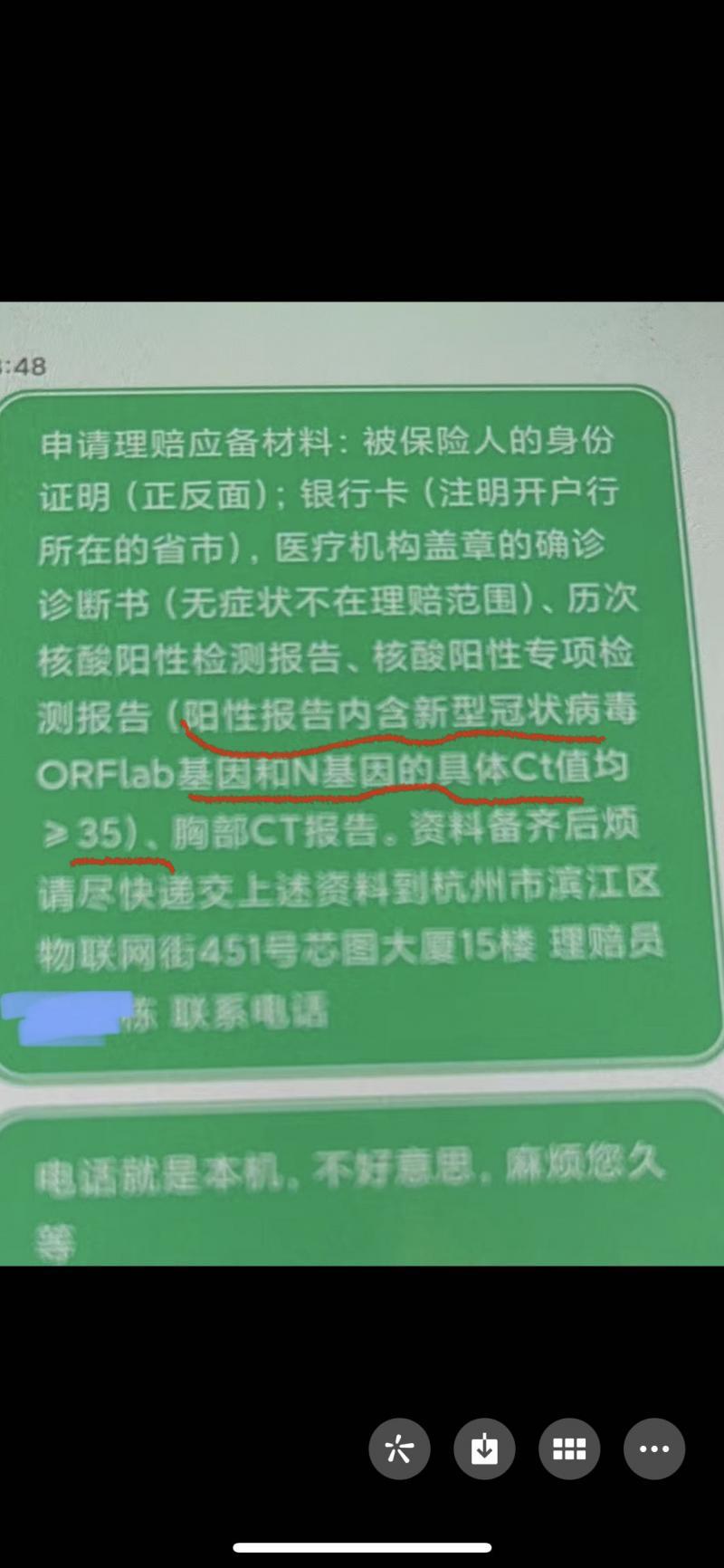 郑先生对照理赔所需材料,连胸部CT都做了,但还少核酸阳性专项检测报告,尤其是具体要求包括“阳性报告内还有新型冠状病毒ORFlab基因和N基因的具体Ct值均大于35”的内容。