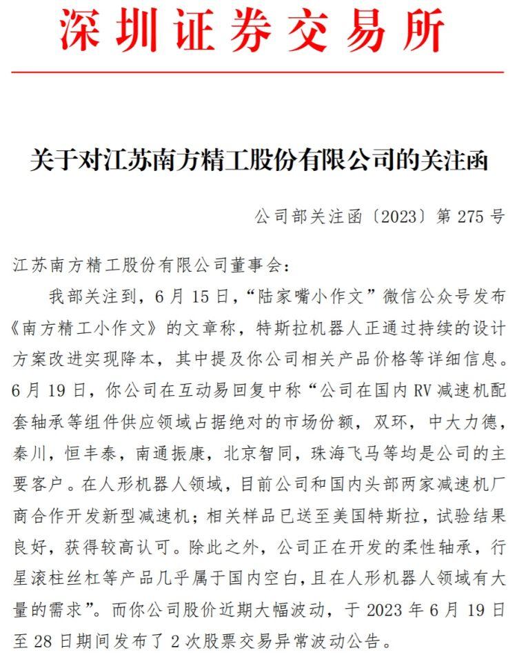 关注函提到,6月15日,“陆家嘴小作文”微信公众号发布《南方精工小作文》的文章称,特斯拉机器人正通过持续的设计方案改进实现降本,其中提及公司相关产品价格等详细信息。6月19日,公司在互动易回复中称“公司在国内RV减速机配套轴承等组件供应领域占据绝对的市场份额,双环、中大力德、秦川、恒丰泰、南通振康、北京智同、珠海飞马等均是公司的主要客户。在人形机器人领域,目前公司和国内头部两家减速机厂商合作开发新型减速机;相关样品已送至美国特斯拉,试验结果良好,获得较高认可。除此之外,公司正在开发的柔性轴承,行星滚柱丝杠等产品几乎属于国内空白,且在人形机器人领域有大量的需求”。而公司股价近期大幅波动,于6月19日至28日期间发布了2次股票交易异常波动公告。