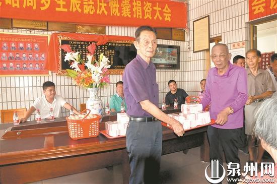 三六一度老董事长丁建通(右)在曾孙周岁时向江头村老年人发放敬老金