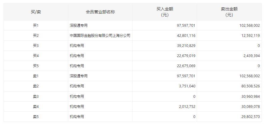 盘后龙虎榜数据显示,深股通专用席位买入9759.77万元并卖出1.03亿元,三机构净买入8212.55万元,四机构净卖出1.66亿元。