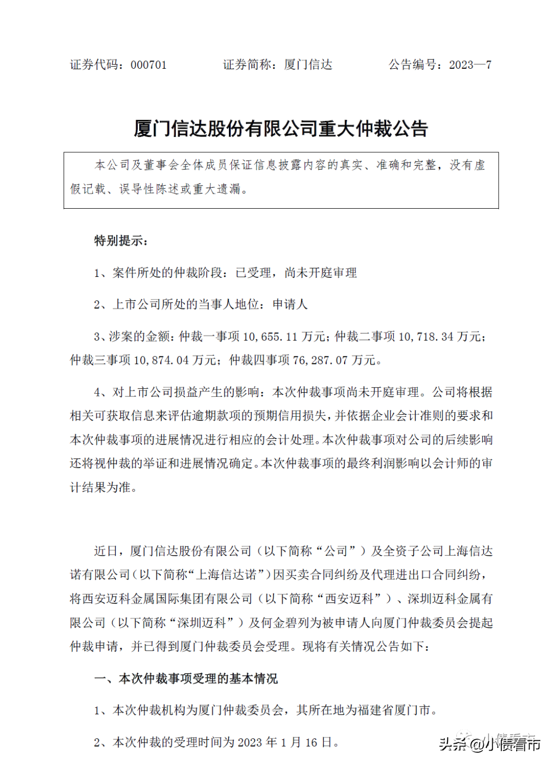 1月20日,厦门信达(000701.SZ)公告称,其及全资子因买卖合同纠纷及代理进出口合同纠纷,将西安迈科金属国际集团有限公司(以下简称:“迈科集团”)、深圳迈科金属有限公司(以下简称“深圳迈科”)及何金碧列为被申请人,向厦门仲裁委员会提起仲裁申请,并已得到厦门仲裁委员会受理。