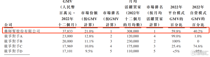 根据Frost&Sullivan数据显示,药师帮在覆盖市场绝大部分药店客户后,2022年院外数字化医药产业行业份额达到21.0%,成为全市场按照GMV市场份额排名第一,GMV达到378.33亿元人民币。按照月均活跃买家来计算,2022年公司平台下游月均活跃买家超过30.8万个,远超于同业水平成为第一。
