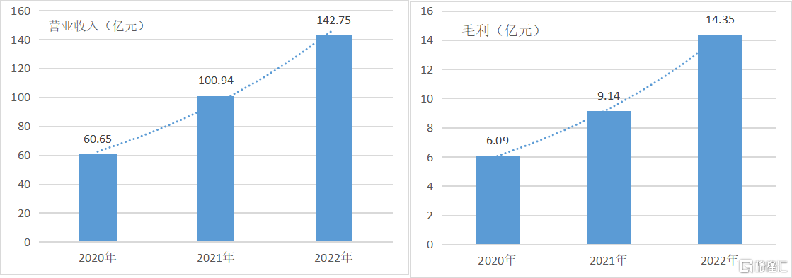 2020年至2022年公司总收入分别为60.65亿元、100.94亿元以及142.75亿元,年复合增长率达到53.42%。