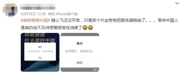 16日,南航官宣即将开售“畅游中国”产品的消息,并销售专用代金券。当日,多名欲购买代金券的网友反映南航App出现服务器崩溃现象。产品正式发售后,多位网友在社交媒体发帖求拼团,也有网友称想再观望一阵,看其他航司是否会推出同类型产品。