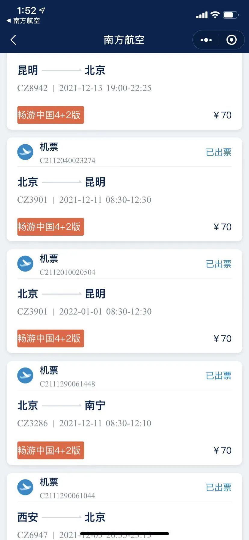 陆先生2021年使用南航“畅游中国4+2版”时的出行记录。图片来源:受访者供图