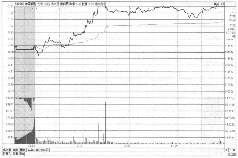如图所示,中国联通(600050)集合竞价期间小幅高开,整个集合竞价期间股价维持横盘状态,但是撮合成交量密集型逐渐放大,多于撮合成交量的委托量也处于逐渐放大状态,直到9:25产生了开盘价后多于撮合成交量的委托量才开始变小。从集合竞价期间的价格上看不出有太大的端倪,但是从中国联通当天集合竞价期间的成交量上就会发现主力资金和市场跟风资金在积极做多,当天的走势是值得期待的。