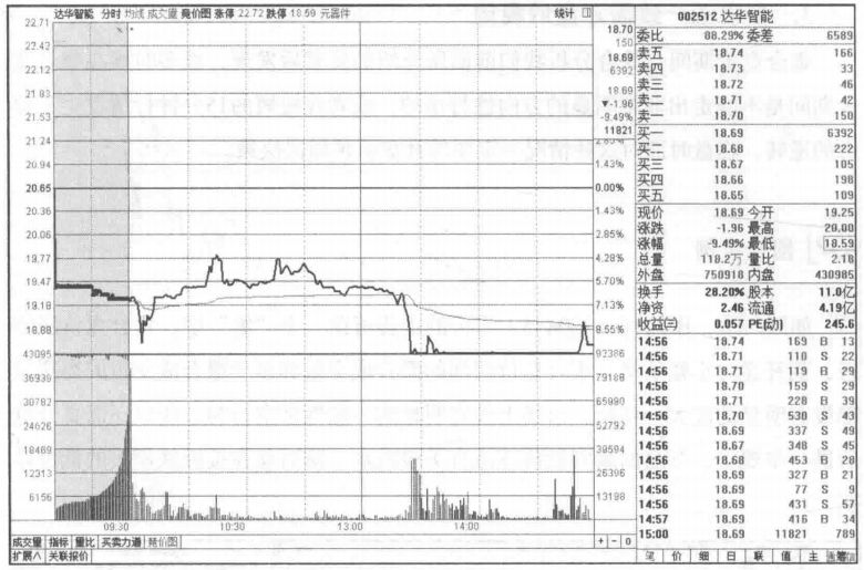 如图所示,达华智能(002512)在集合竞价期间股价持续下移,撮合成交量不断放大,并没有明显的多空能量的偏移,多于撮合成交量的委托量也没有太大,所以集合竞价期间的走势使我们得出当天股价走势并不会十分乐观的结论。股价全天在低位横盘震荡,虽然有打到过跌停板,但是还是时有打开。