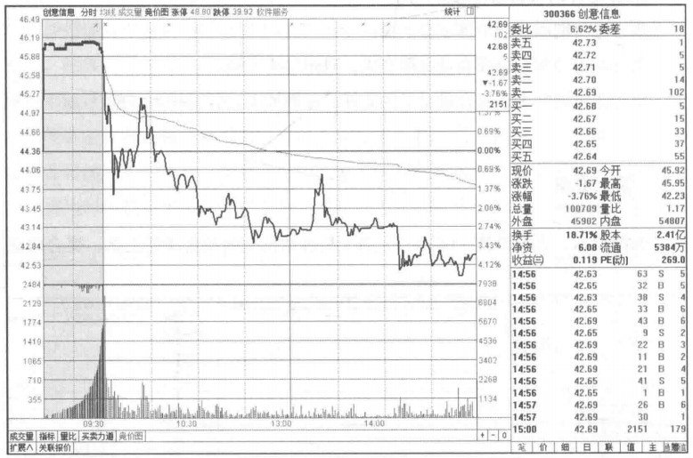 如图所示,创意信息(300366)集合竞价高开后在高位横盘,撮合成交量一度放大,但是多于撮合成交量的委托量并没有明显的变化,集合竞价期间多空能量是平衡的,没有明显偏向哪一方,至少当天很难看出股价有积极上涨的可能。开盘后股价直接跳水,股价进入了绿盘区,整体走势变弱,当天以谨慎操作为主。