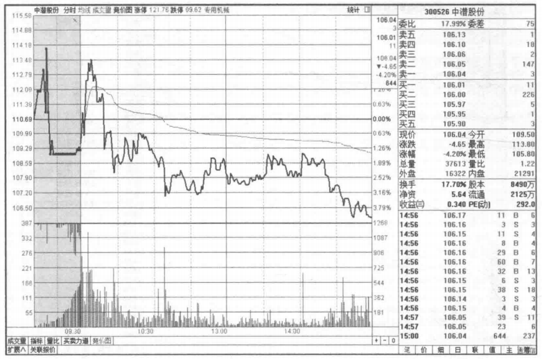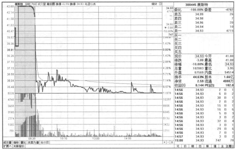 如图所示,康斯特(300445)当天的走势可谓一个“绝”字,集合竞价涨停板,到开盘时小幅下滑,集合竞价期间的撮合成交量和多于撮合成交量的委托量都没有明显的放大的特征,市场上没有明显的一致性多空行为,所以还需要开盘后进一步观望。开盘的瞬间股价飞流直下般跳水,随后就在接近跌停板的低位震荡。