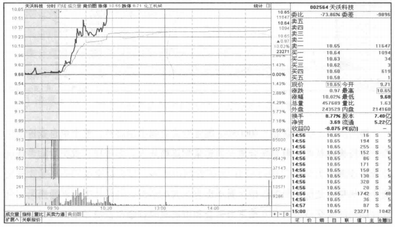 如图所示,天沃科技(002564)当天集合竞价期间股价缓慢上扬,撮合成交量和多于撮合成交量的委托量都缓慢变大,且委托买入的量明显多于委托卖出的量,市场惜售痕迹明显。但是从集合竞价的走势来看,至少在集合竞价期间主力资金没有明显参与并且积极做多的表现,所以遇到这样的集合竞价盘口需要等待开盘后进一步观察才可以做交易决定。