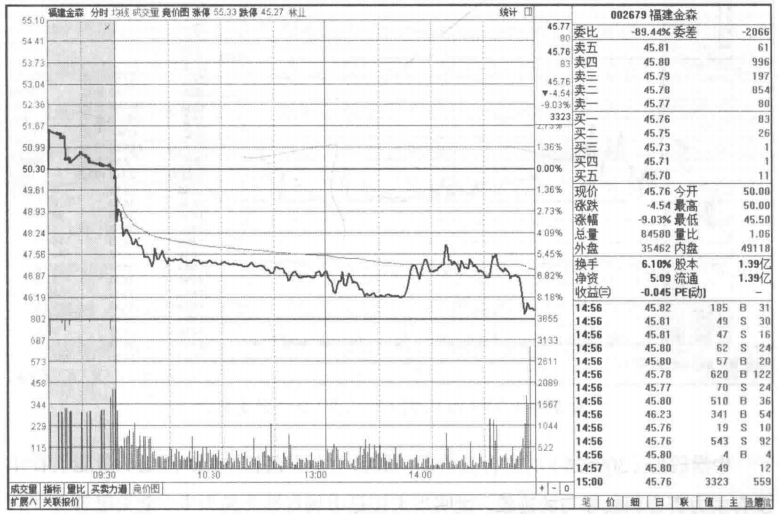 福建金森(002679)的集合竞价是最要防范的一种。集合竞价的初期股价还在红盘区,有的股票的涨幅甚至可以达到5%以上,但只是昙花一现,股价一直下滑,到开盘时股价已经下滑到绿盘区,有的甚至下滑到跌幅5%附近。如图所示,福建金森在集合竞价期间的价格从上涨2%到下跌2%,从量能的变化上来看主力资金参与度不高,当天很难走出漂亮的多头行情。