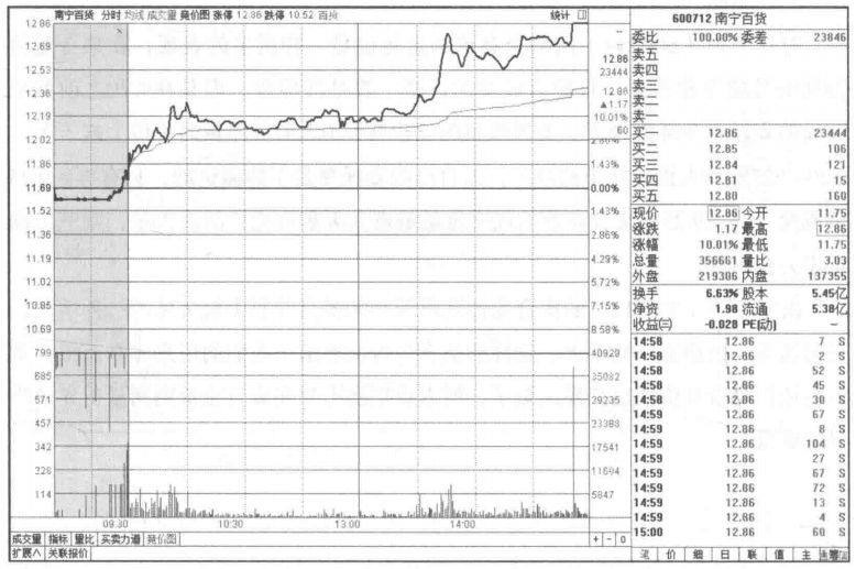 南宁百货(600712)的集合竞价是每天3000多只股票中最常见的一种情况,交易清淡,价格涨跌幅不大,这样的集合竞价能够给予我们的信息非常有限,就不能依据集合竞价做出交易决策了,所以要把精力放在集合竞价期间量价异动明显的股票上。