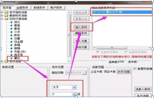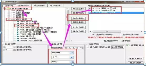 成交量“,设置好成交量的条件,加入到”组合选股条件“中。
