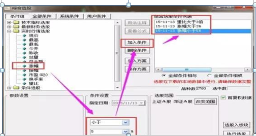 在“实时行情选股“中,再把涨幅条件设置好,加入到”组合选股条件“中。