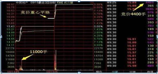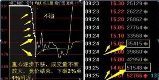 竞价分时常见两种。第一种是重心逐渐下移,不佳;第二种重心平稳,最佳。对应的案例有银江股份和中房地产,两者竞价均放量,但分时不同,最终的结果也不同。