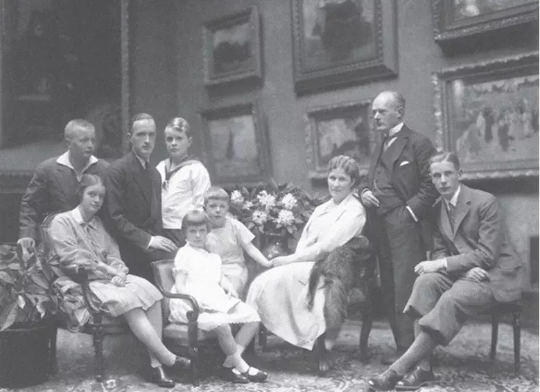 1928年,贝莎·克虏伯(右三)、古斯塔夫·冯·博伦(右二)与7个孩子合影,两人先后养育了8个孩子(一个死于1909年)。除了长子小阿尔弗雷德(左三)继承了克虏伯的姓氏之外,他的弟弟妹妹均姓博伦