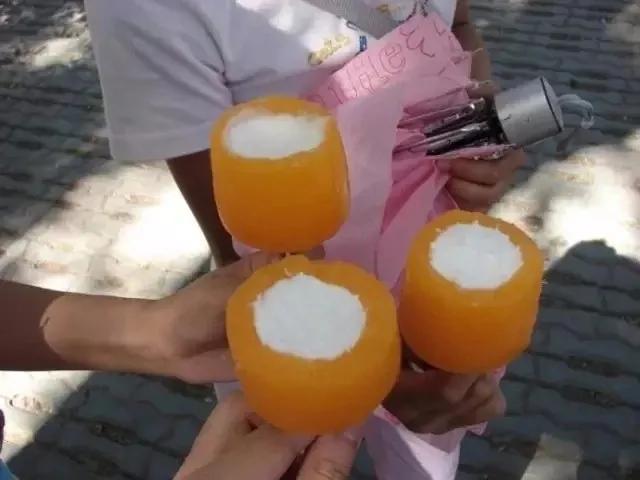 袋装的饮料,两毛一袋,在冰柜里冻成冰,边角处咬一个小口就可以慢慢地边吃边喝,一袋可以吃好久。