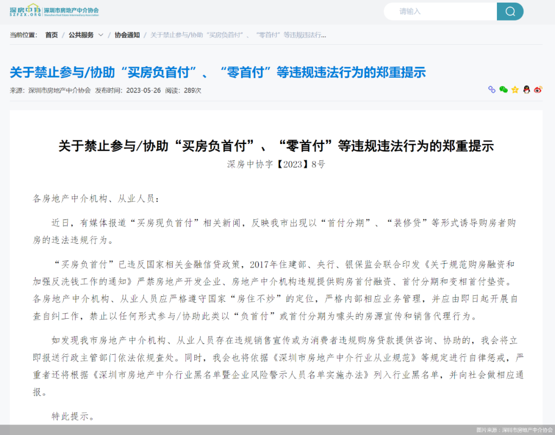 深圳市房地产中介协会指出,各房地产中介机构、从业人员禁止以任何形式参与/协助此类以“负首付”或首付分期为噱头的房源宣传和销售代理行为,如发现深圳市房地产中介机构、从业人员存在违规销售宣传或为消费者违规购房贷款提供咨询、协助的,将立即报送行政主管部门依法依规查处。