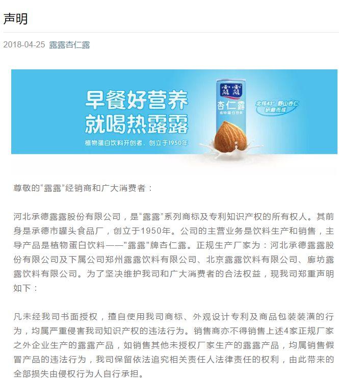 2018年4月25日,河北承德露露股份有限公司在其官方微信上发布打假声明称,除北京、郑州、廊坊等四家公司生产的露露杏仁露外,其余企业生产的均为假冒产品。承德露露还称,利乐包装产品也是侵权产品。